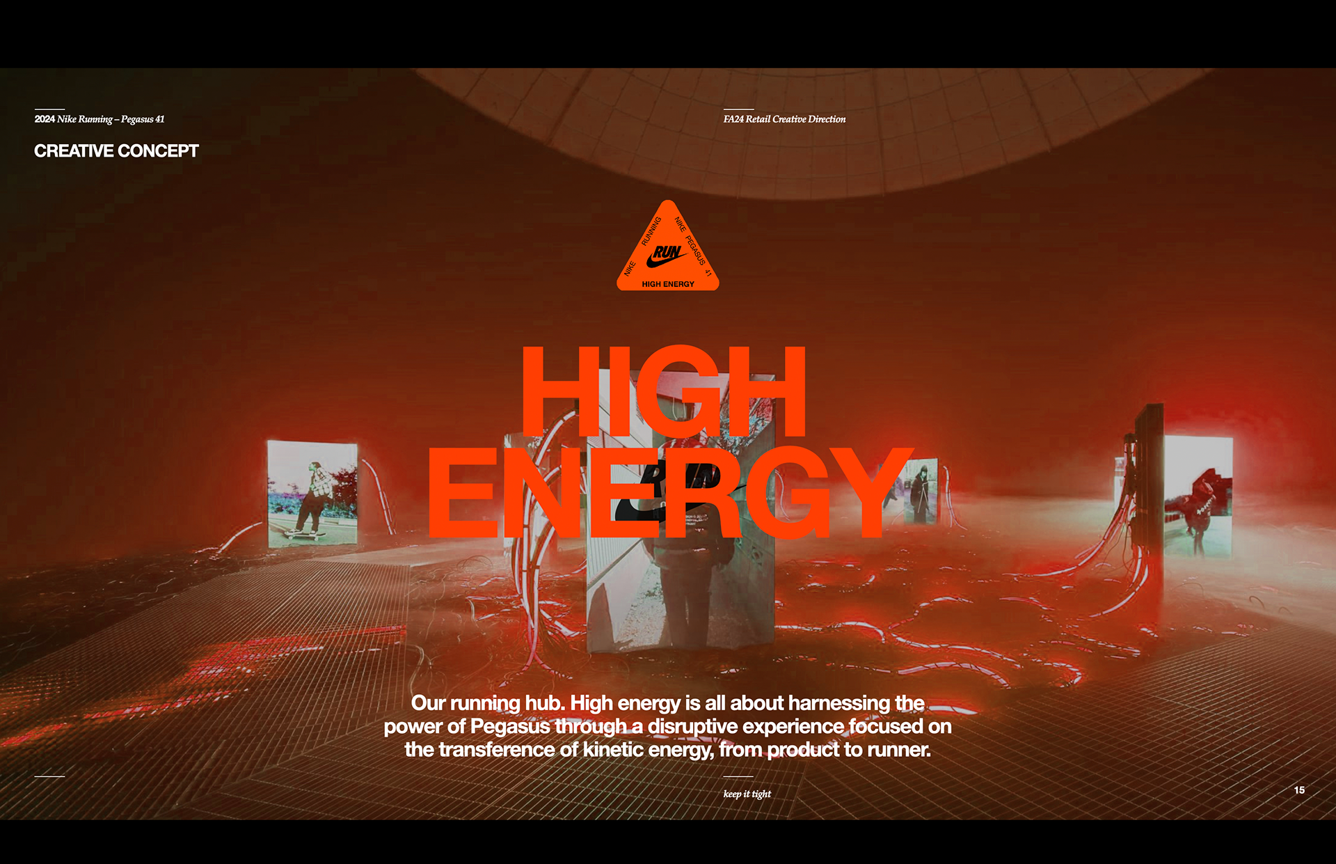 A retail campaign focused on the energy return qualities of the Pegasus 41. The retail experience toed the line between metaphor, innovation, and community. Building off of the Pegasus 41 stunt, this works spanned pinnacle, elevated, and partner executions.
